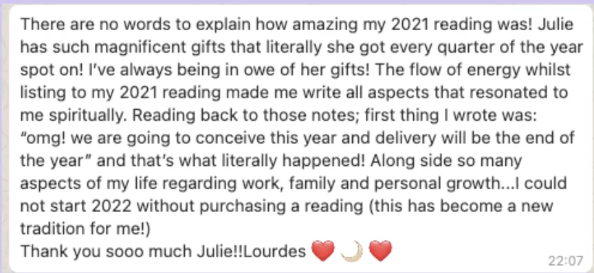 Had a wonderful reading with Julie some weeks ago, some of her predictions are starting to manifest which is incredible to see. Thank you Julie!