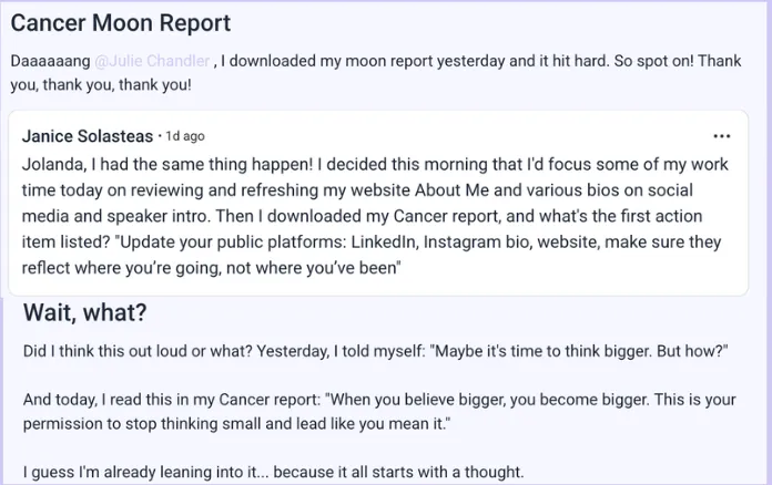 I like the approach Julie has with the astrology piece into my business - I had never thought to put them together - I do the new and full moon prompts inside Moon Boss and I’ve had lots of Ah-Ha’s! It’s been so helpful because it helps me stop and reflect to align with the cosmos. Moon Boss helps me to stop and reflect and see what's going on in the cosmos about how I can move through my business, is it time to launch is a time to sit back Is it time to plant seeds and then I can also do that with my clients that I'm working with, with their courses or with their email marketing I use the prompts Julie provides in order to talk with my clients so it's helped their business, it's helped my business, it‘s helped me to connect to my clients and I so I highly recommend Moon boss